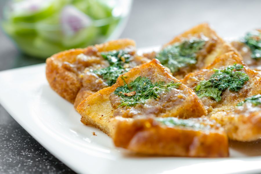 「カノム」が”お菓子”、「パン」が”パン”、「ナー」が”上”、「クン」が”エビ”という意味なので、日本語に訳すとタイの「エビトースト」ですね。
