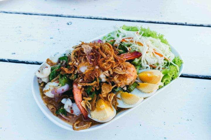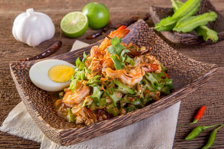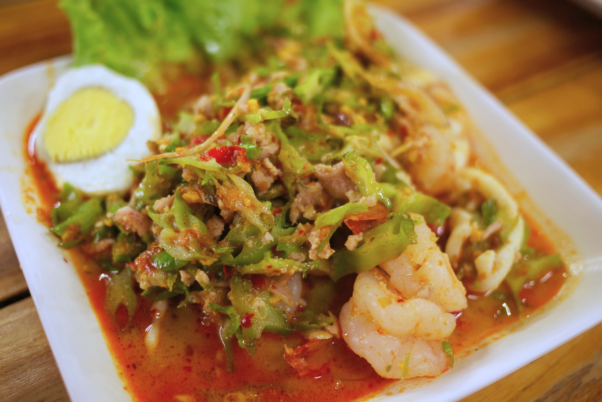 四角豆を細かく切って、エビやイカと一緒にナンプラーやライム、ガーリック、唐辛子などで和えるタイ特有の甘辛スパイシーサラダですが、激辛ではないので日本人にもおすすめできるタイサラダです。