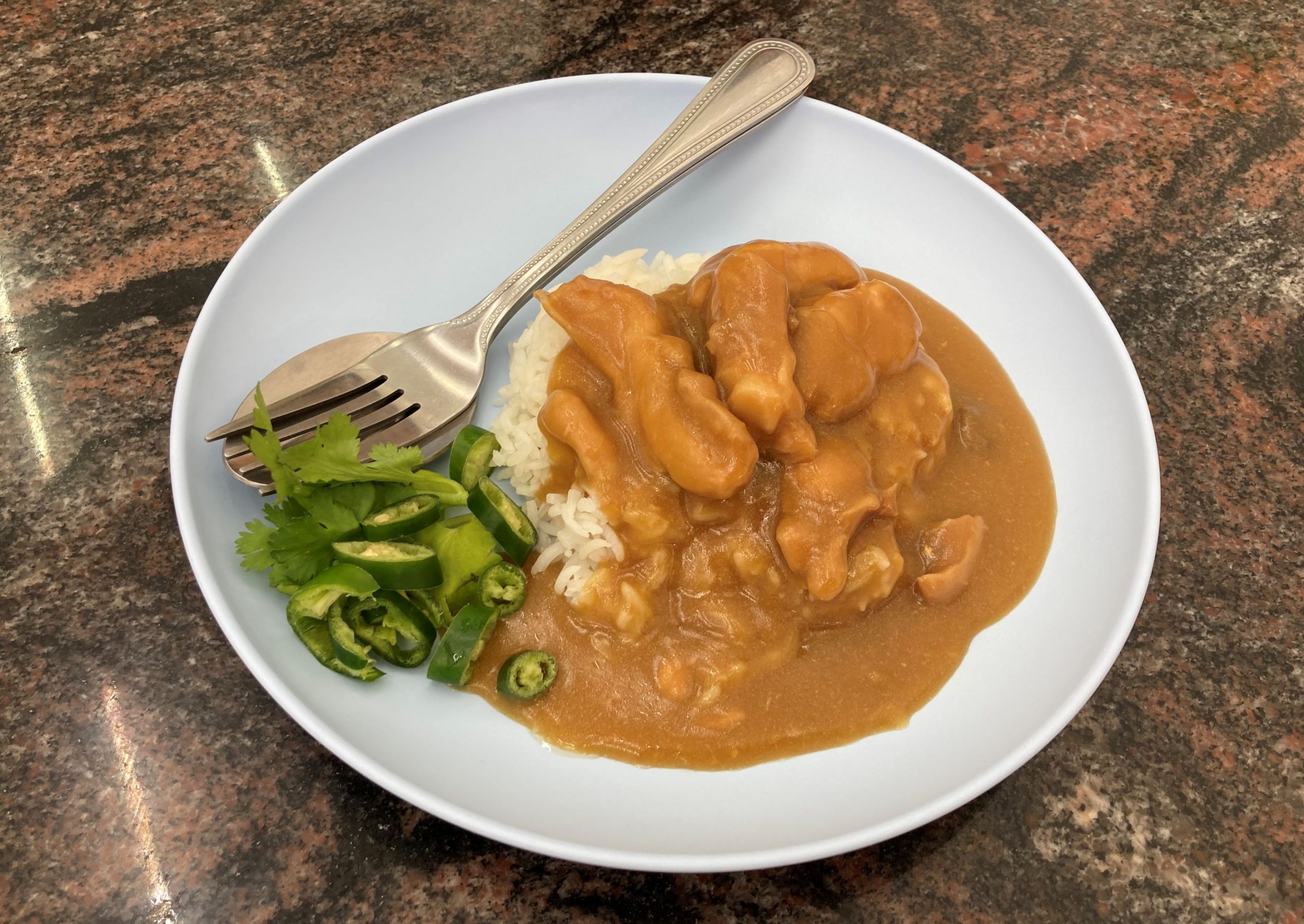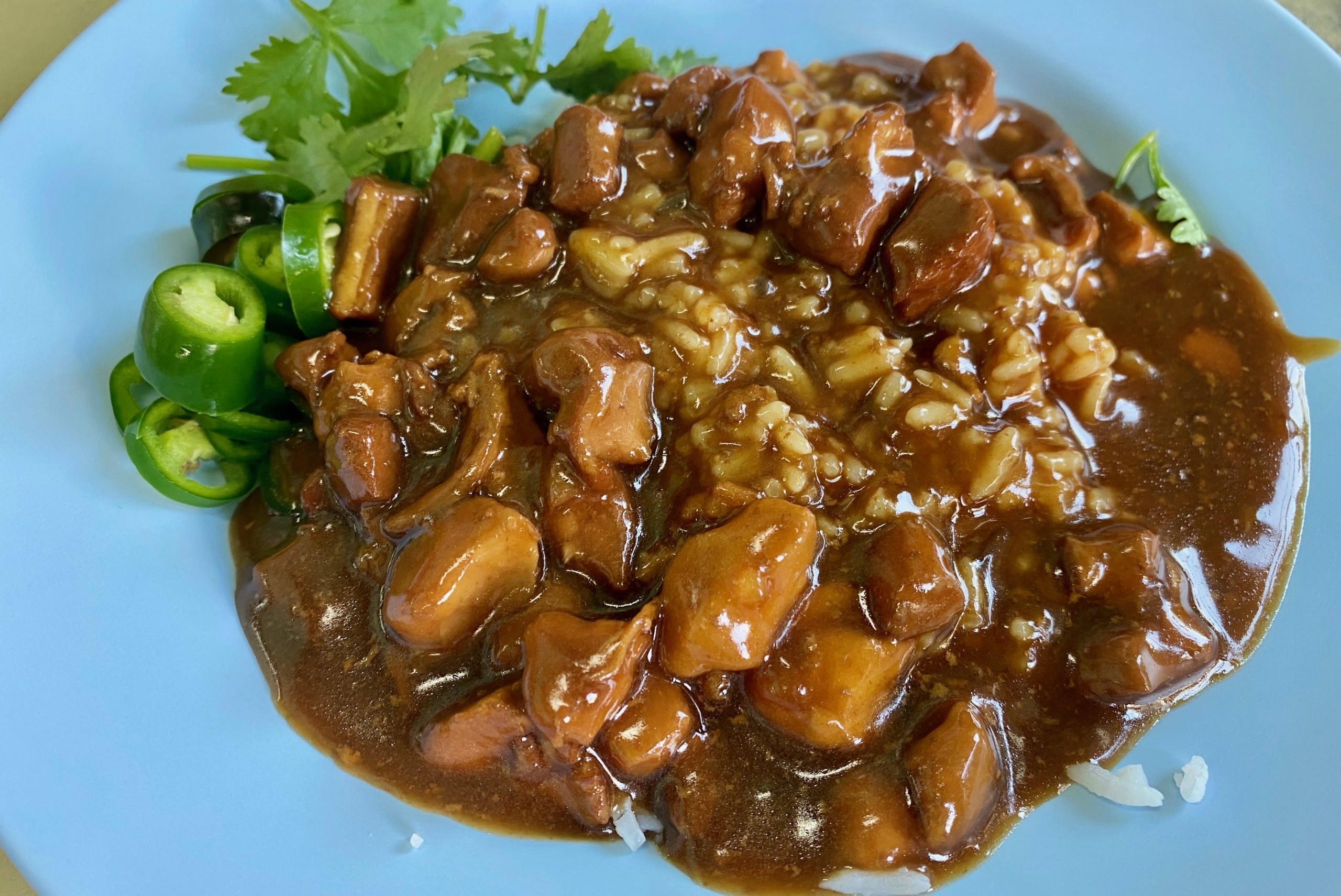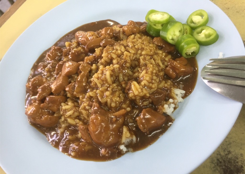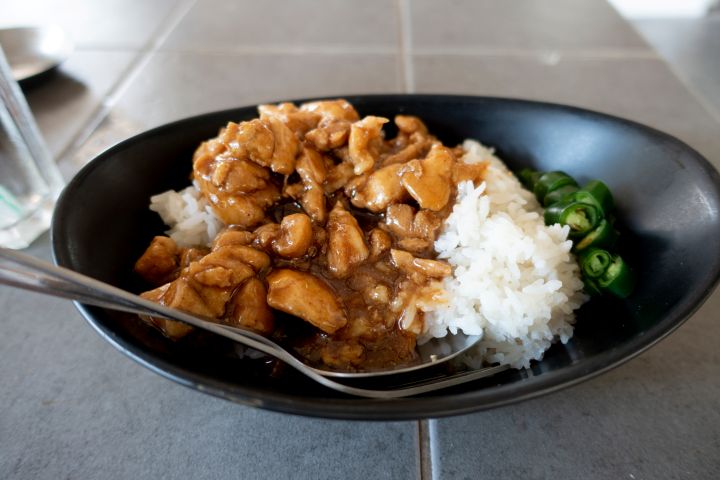 「カオ」が”ご飯”、「ナー」が”上”、「ガイ」が”鶏肉”という意味なので、日本語に訳すと「鶏肉のあんかけご飯」ですね。